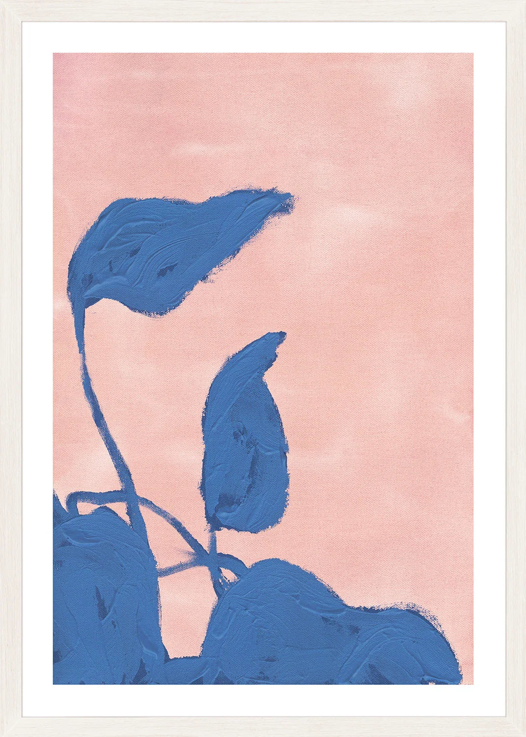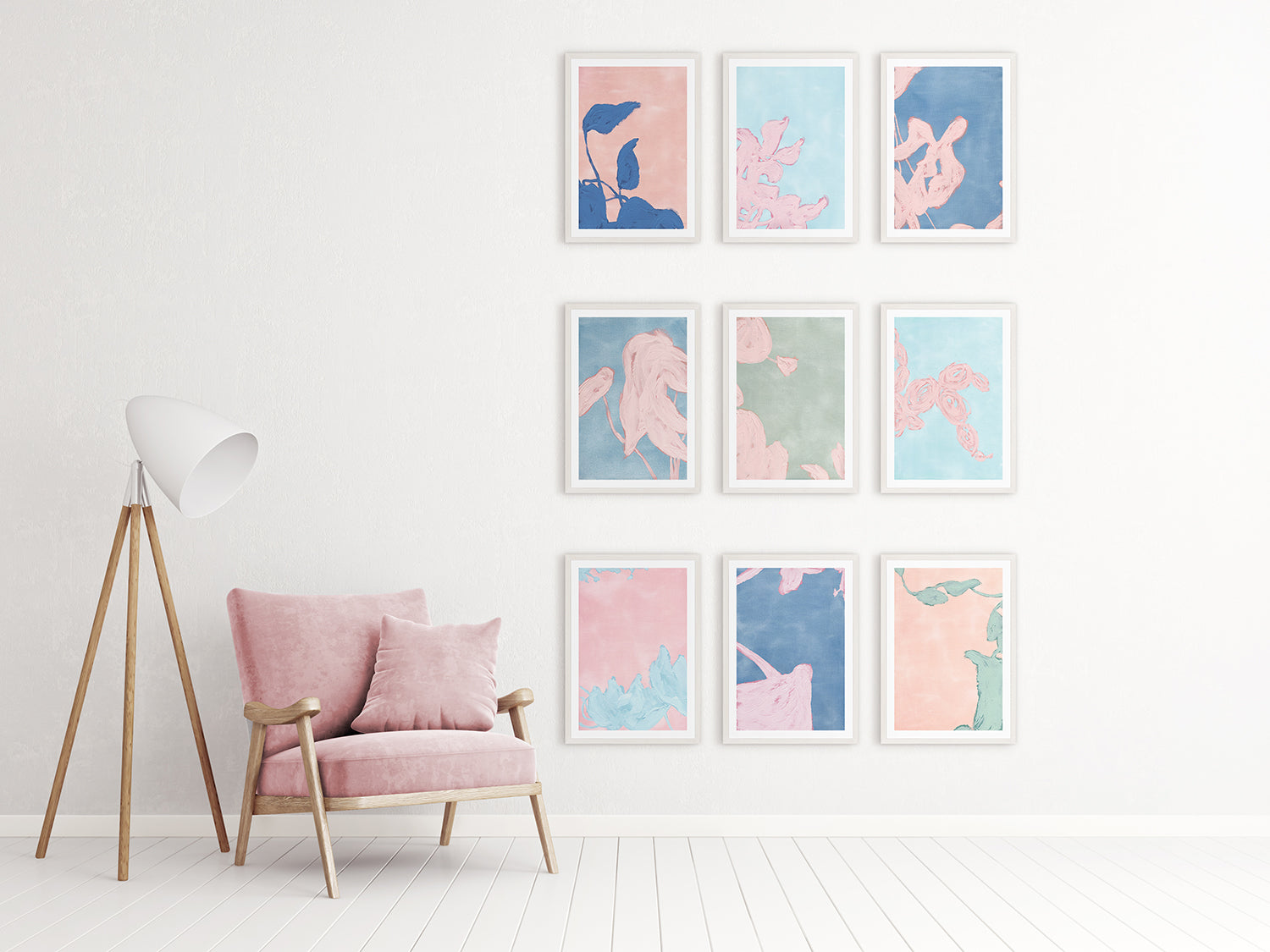 Des plantes abstraites aux couleurs fraîches et sorbet. Des coups de pinceau amples et précis sur un fond de toile représentent librement des formes botaniques, utilisant l'espace négatif pour créer des compositions intéressantes.