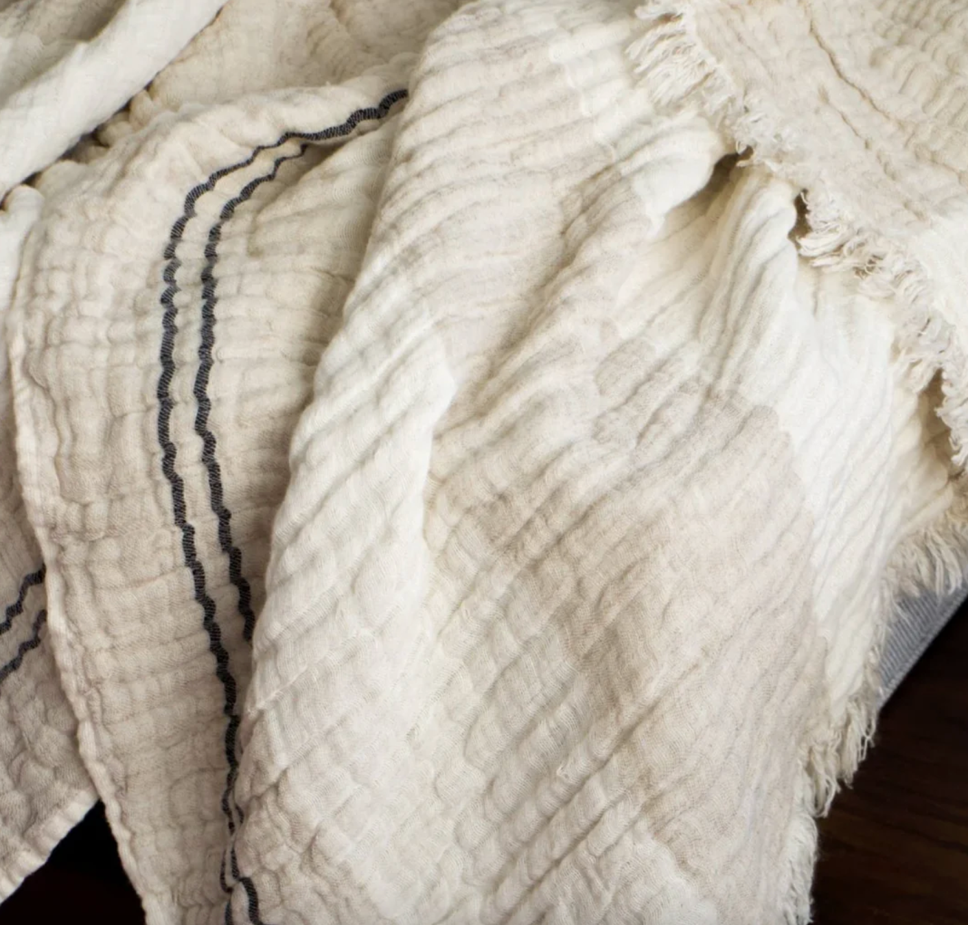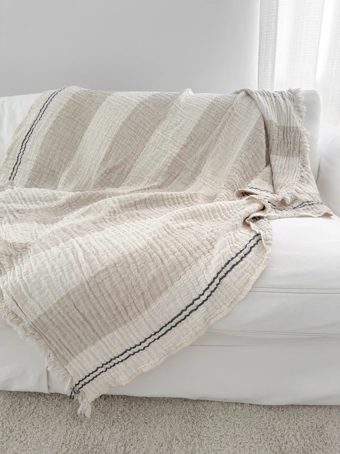 Le plaid rayé en lin froissé de luxe est confectionné en lin doux, naturellement respirant. Son doux motif froissé est associé à des rayures noires tissées sur la bordure. Ce plaid s'agencera facilement, saison après saison.