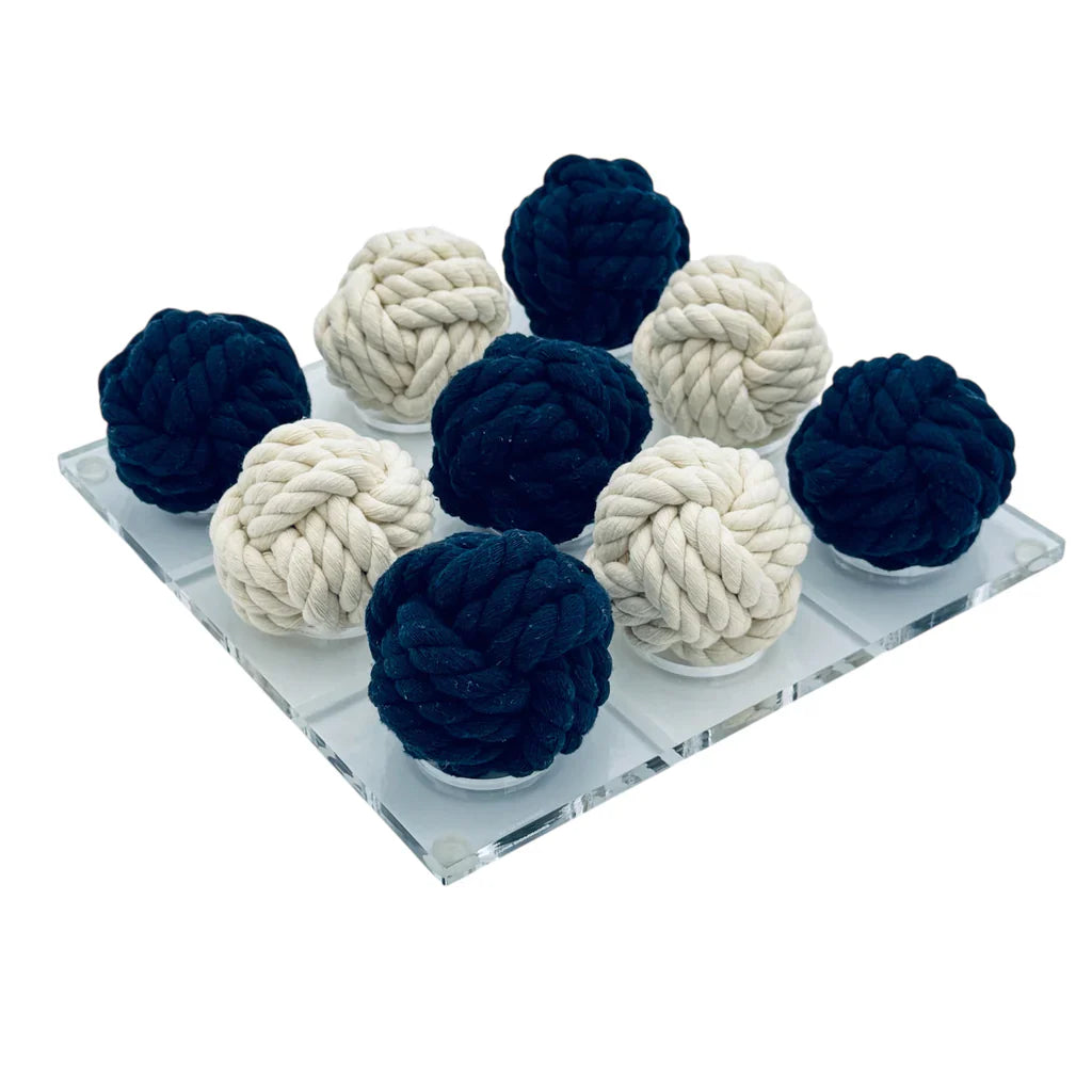 Tic-Tac-Toe avec une variante utilisant des nœuds de poing de singe pour les X et les O. Chaque boule mesure un peu plus de 3 pouces et le plateau mesure 11x11 pouces.