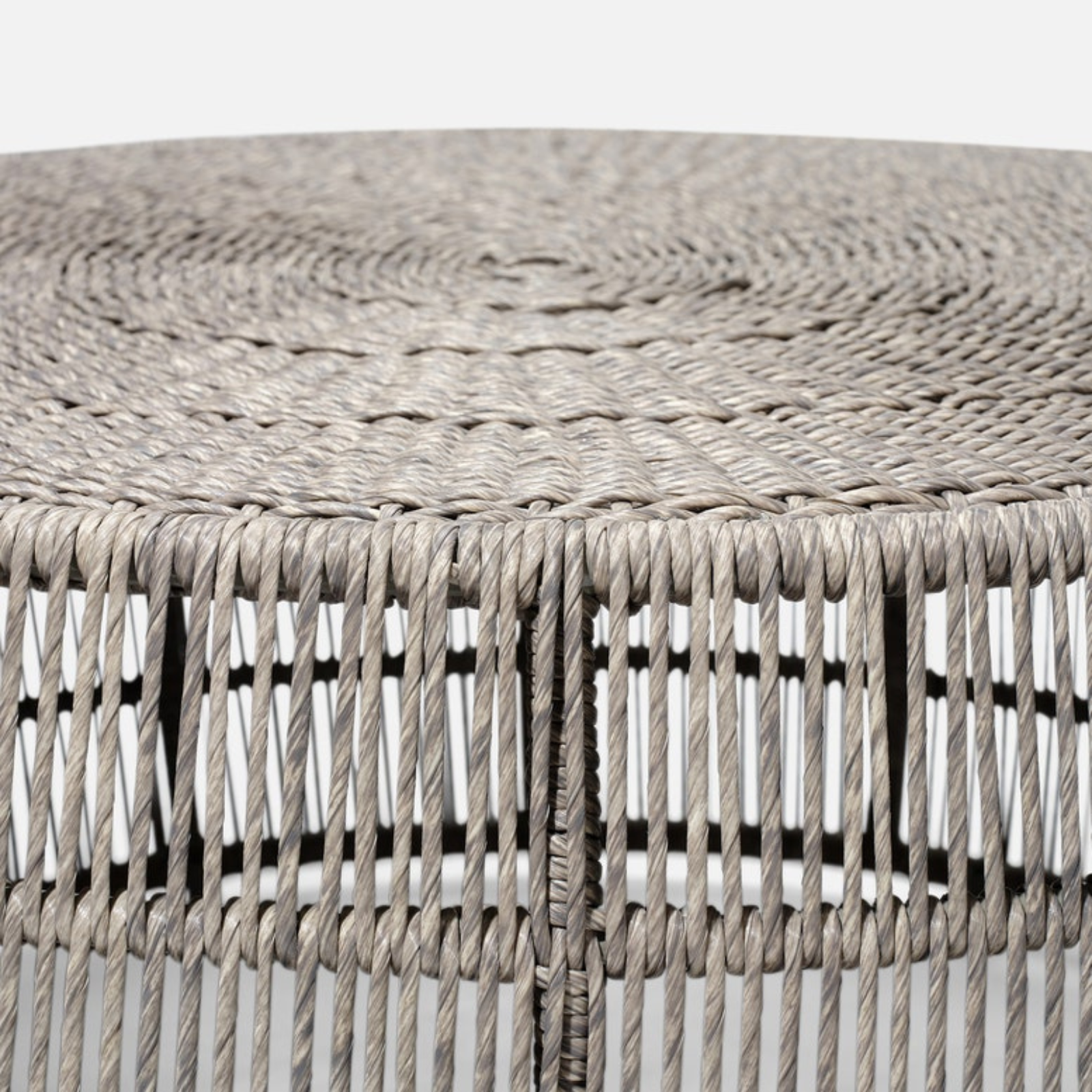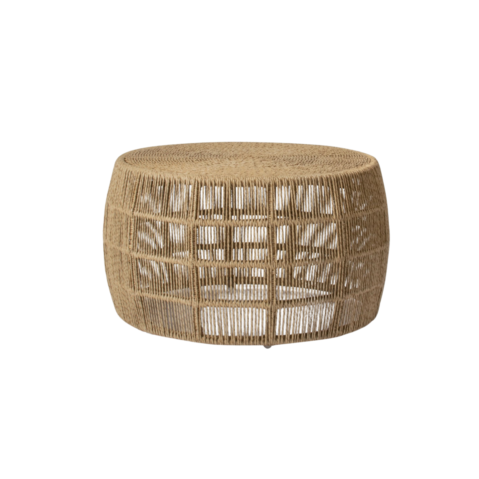 Cette table basse d'extérieur légère et aérée est fabriquée à partir de rayons d'osier synthétique torsadé, tissés sur un cadre en tonneau simple avec un motif de grille sous-jacent subtil.
