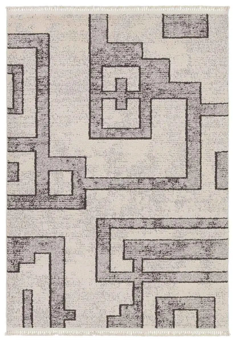 La collection Lore présente un assortiment de motifs marocains modernes et une texture unique qui confère aux espaces un style affirmé. Le tapis Bungalow présente un motif géométrique vieilli, des poils coupés et bouclés et des franges couleur crème. Les tons neutres contrastés de gris et de crème offrent un ancrage parfait au design contemporain. Ce tapis d'intérieur s'intègre parfaitement dans les pièces à faible et moyenne fréquentation, comme les chambres, les salles à manger, les salons et les espaces invités.