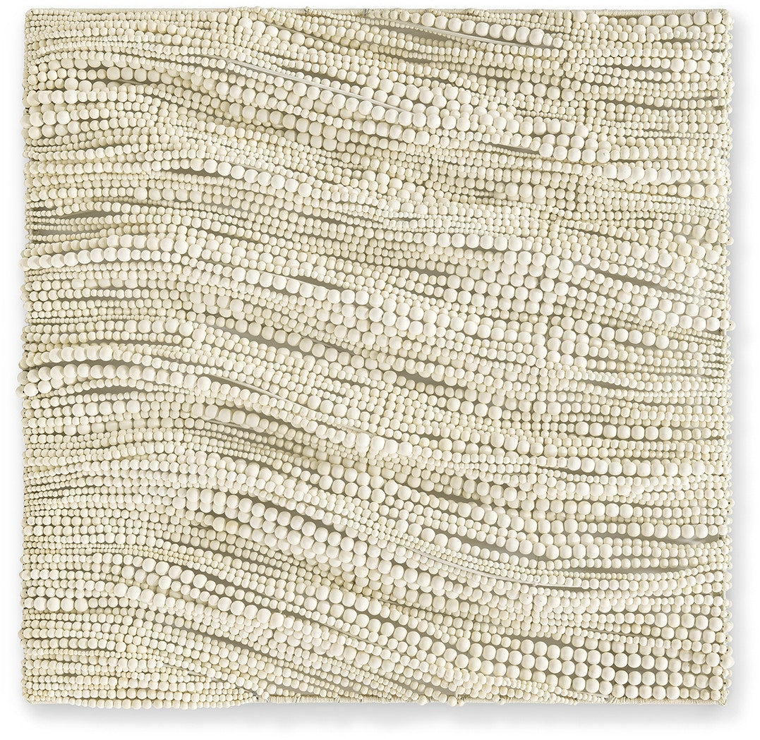Perles de bois au fini blanc doux, cousues à la main sur un cadre en métal. La décoration murale est livrée avec des crochets métalliques pour une fixation verticale et horizontale.