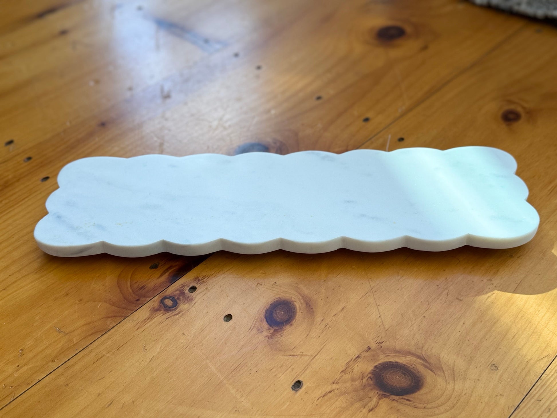Plat de service en marbre festonné avec petits pieds en boule argentés