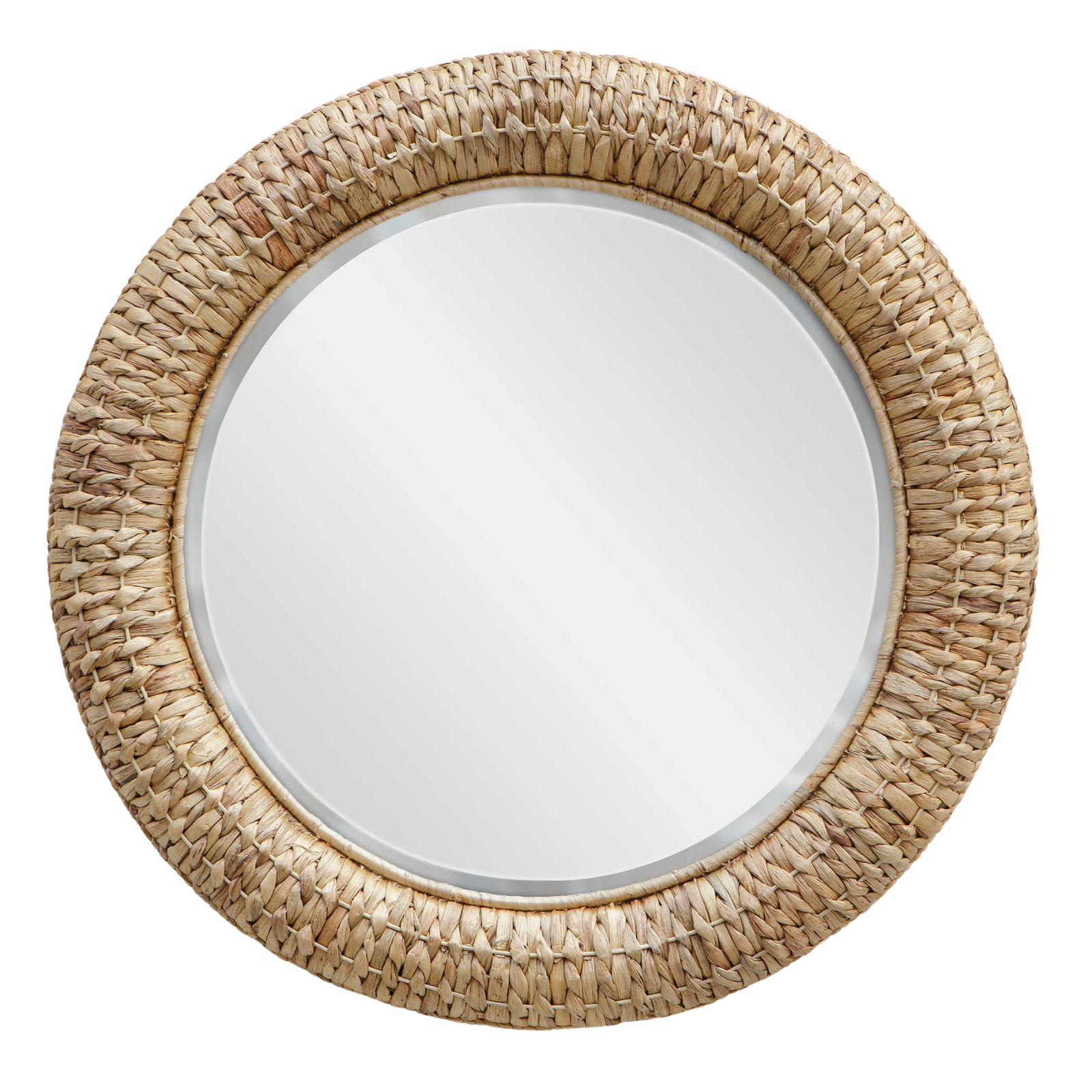 Ce miroir rond dégage une ambiance côtière grâce à son alternance d'herbes marines naturelles torsadées sur un cadre arrondi rehaussé d'une bande de chant torsadée assortie. Le miroir présente un biseau généreux de 3,2 cm.