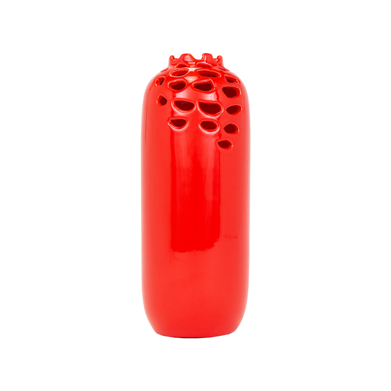 Ce vase moderne en céramique présente un design innovant avec des découpes ovales distinctives sur sa partie supérieure, créant un jeu artistique d'ombres et de lumières. Sa silhouette élégante et allongée et sa finition brillante ajoutent une touche de sophistication à votre décoration, tandis que sa qualité sculpturale lui permet d'être aussi bien un vase fonctionnel qu'une œuvre d'art à part entière. Parfait pour exposer des fleurs à tige haute ou des compositions florales séchées, il constitue également une pièce d'accent attrayante à lui seul. Ses lignes épurées et son profil spectaculaire en font une pièce maîtresse idéale pour une table à manger, une console ou une cheminée, où il s'intègre aussi bien aux styles d'intérieur modernes que transitionnels. Sa riche couleur rouge apporte chaleur et énergie à tout espace, le rendant particulièrement percutant sur des fonds neutres ou dans une palette de couleurs soignée dans la décoration de votre pièce.