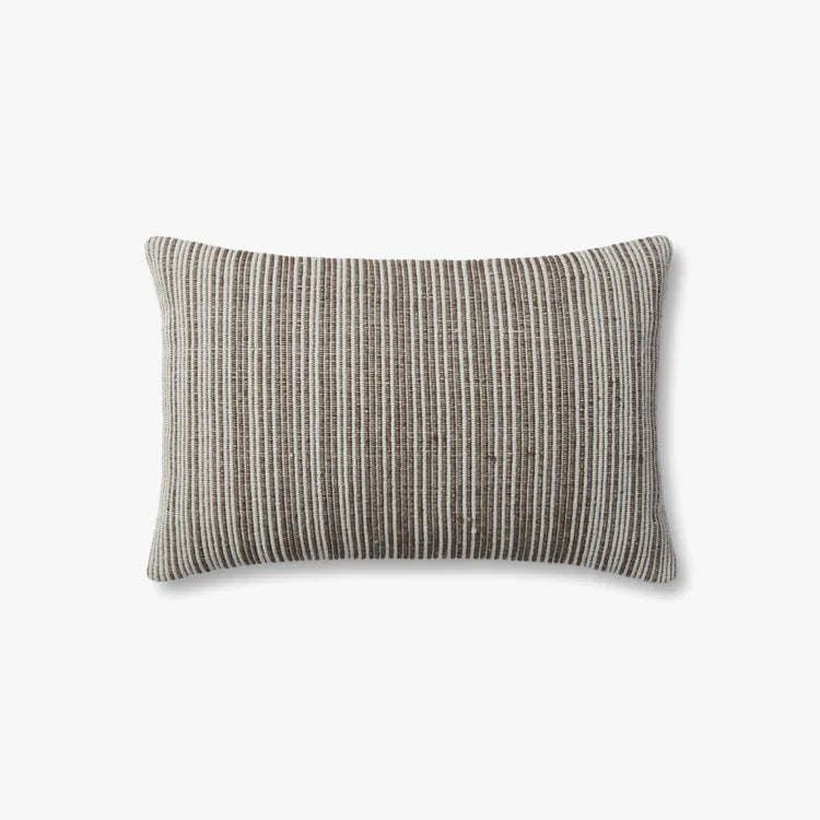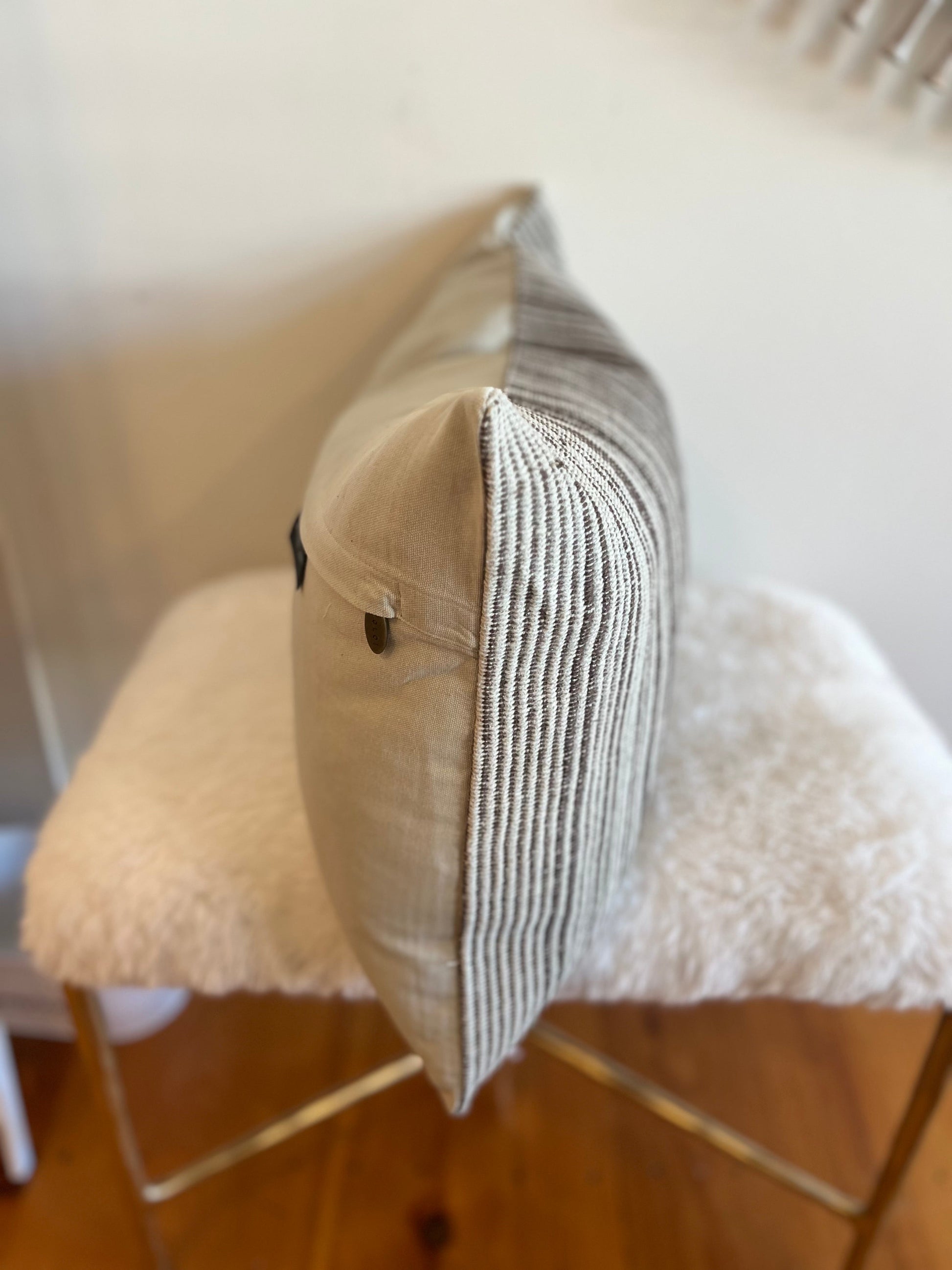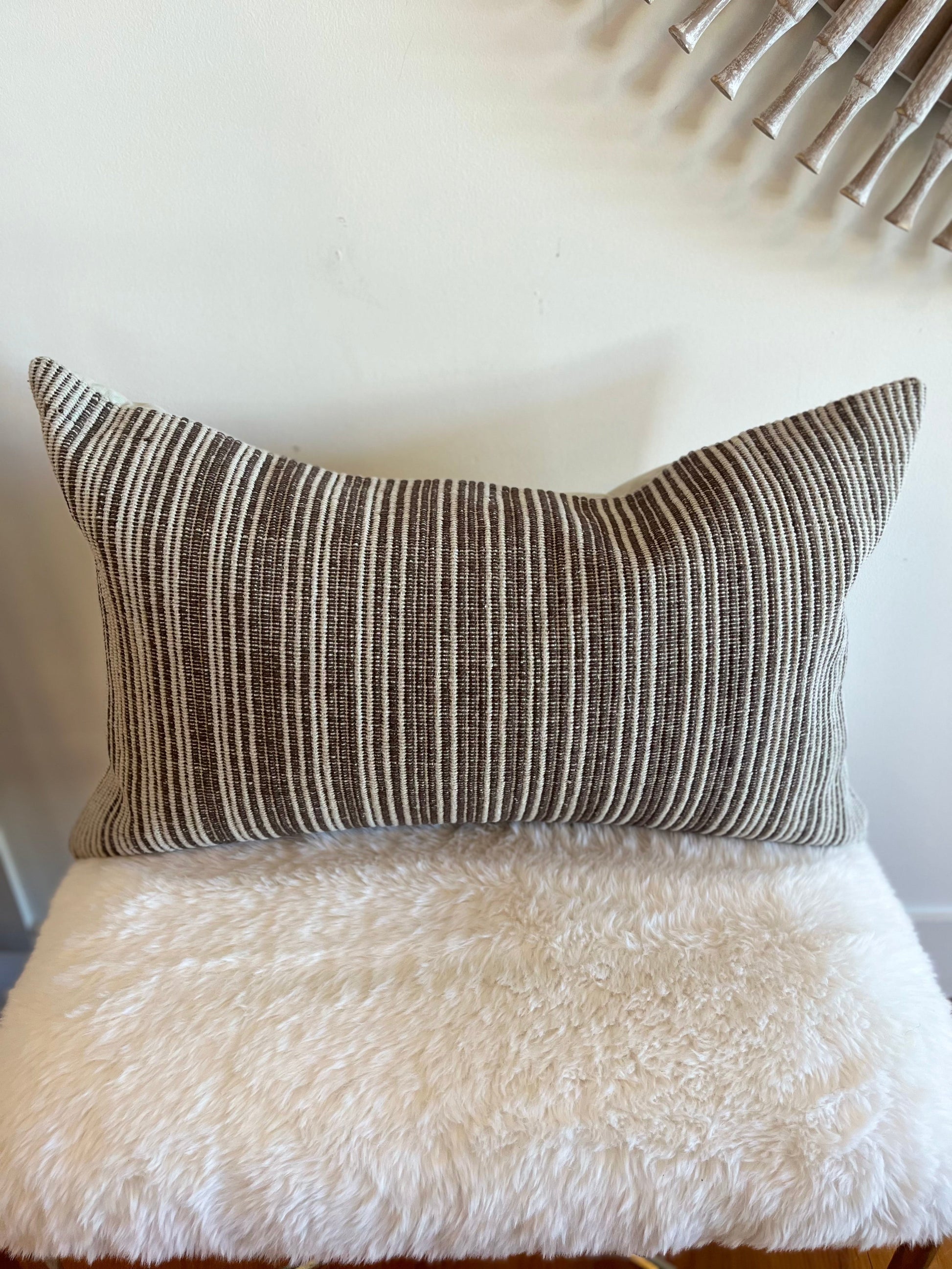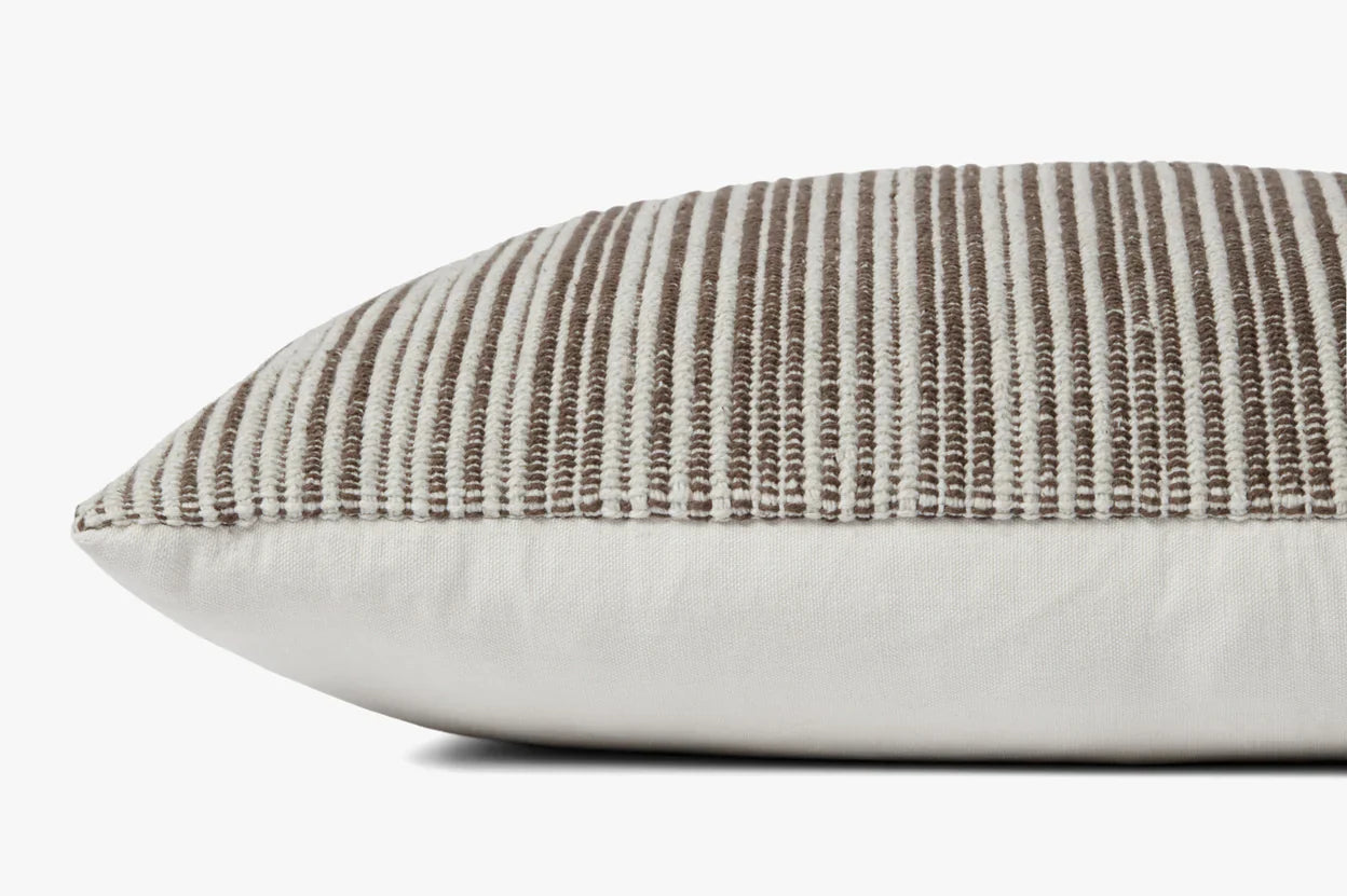 Ce coussin tissé à la main présente des rayures verticales marron clair et crème avec une esthétique texturée et organique.