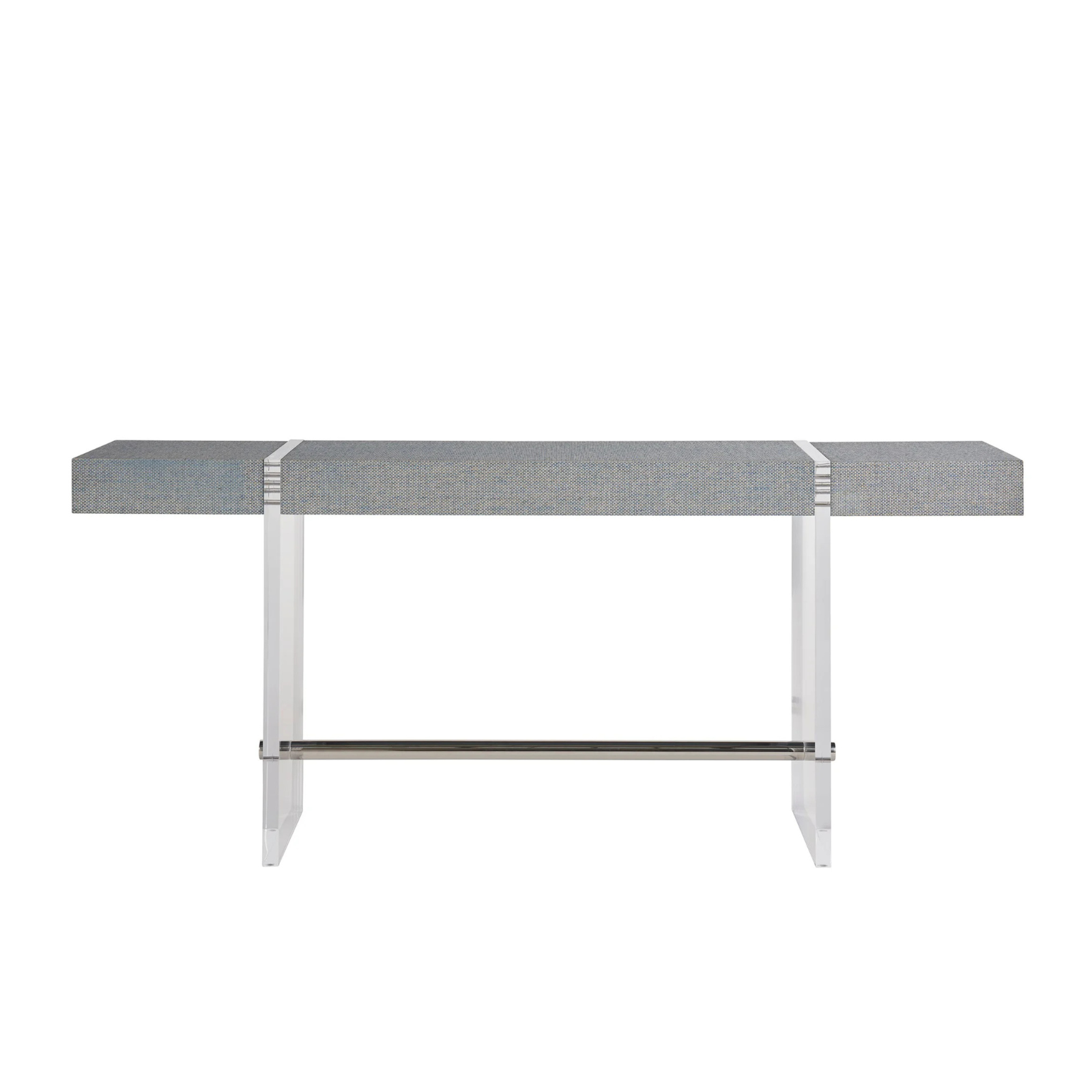 Glamour plage moderne ! Cette console élégante a un Le plateau est recouvert d'un tissu en jonc de mer bleu clair, créant un contraste texturé avec les élégants pieds en lucite. Une traverse inférieure argentée est également présente.