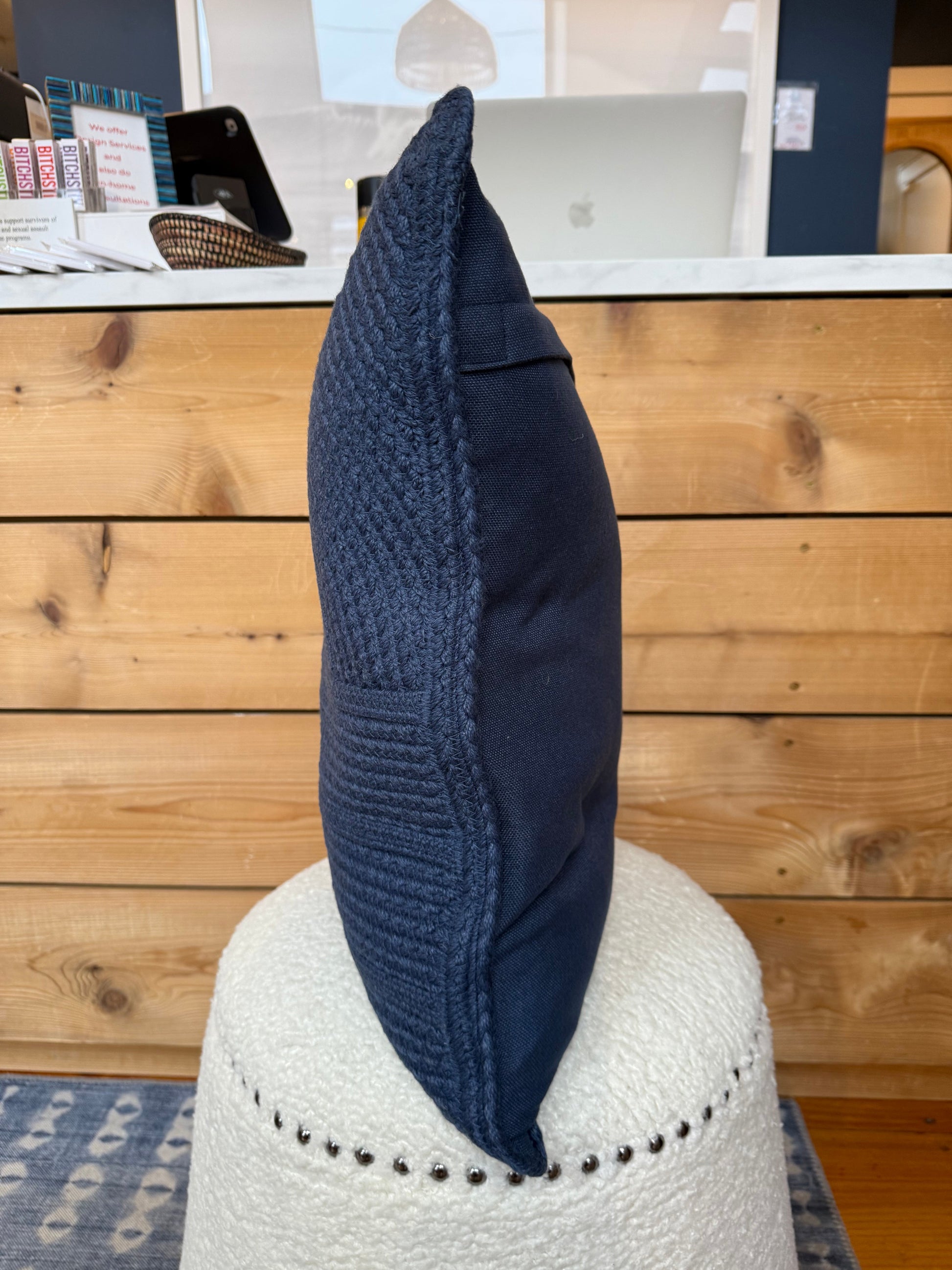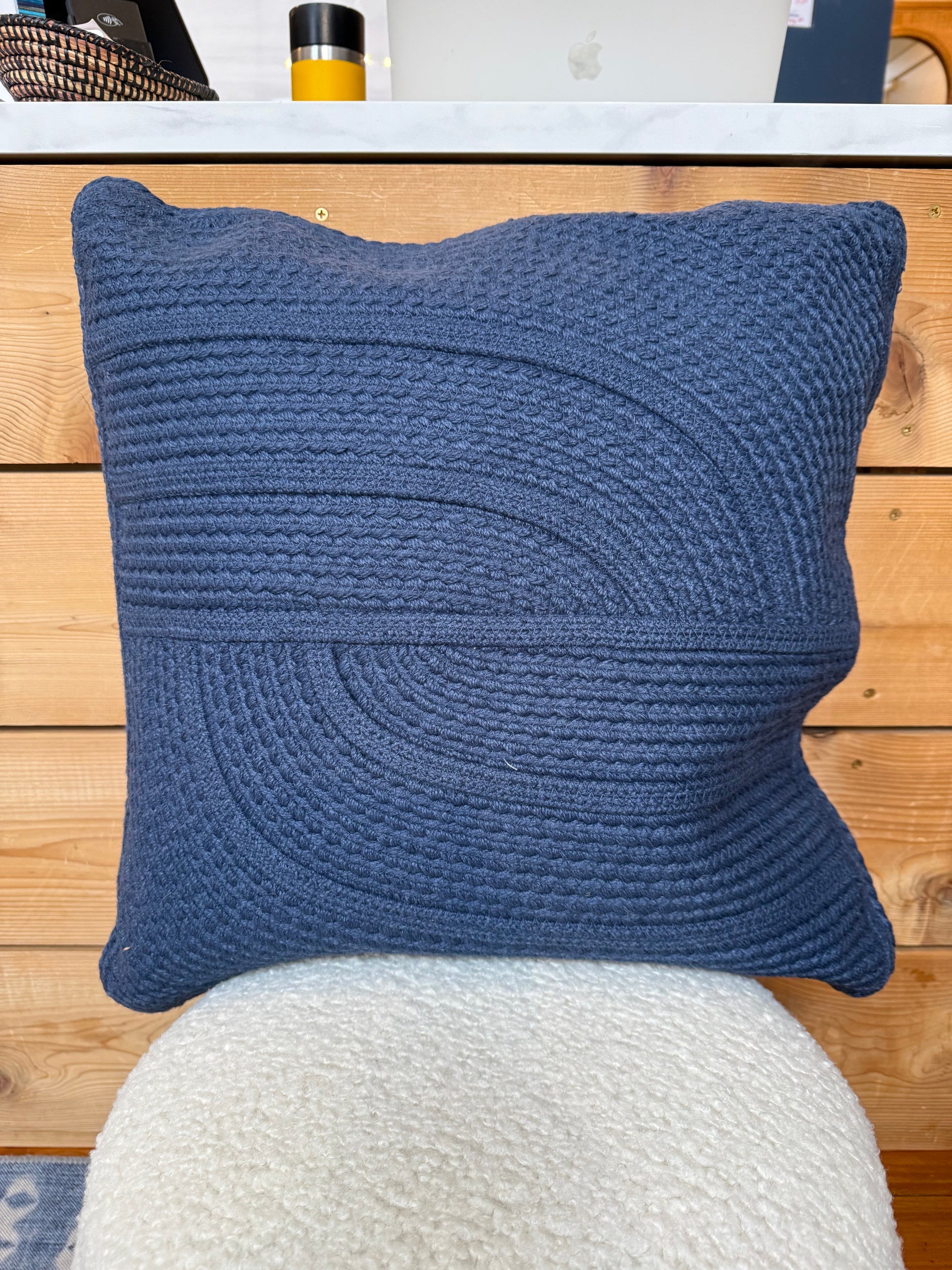 Ce coussin bleu est tissé à la machine avec des lignes qui ajoutent une texture ludique.